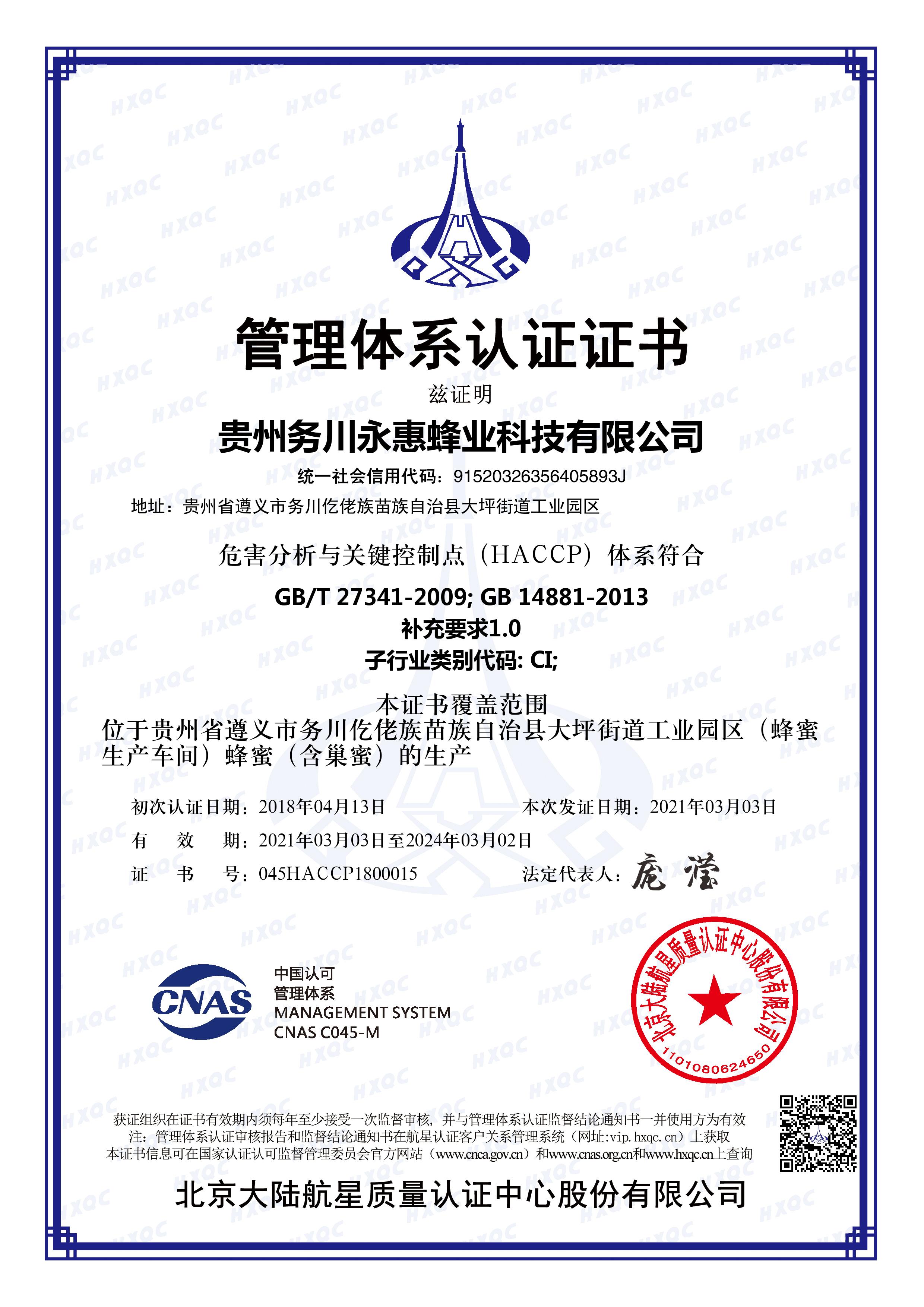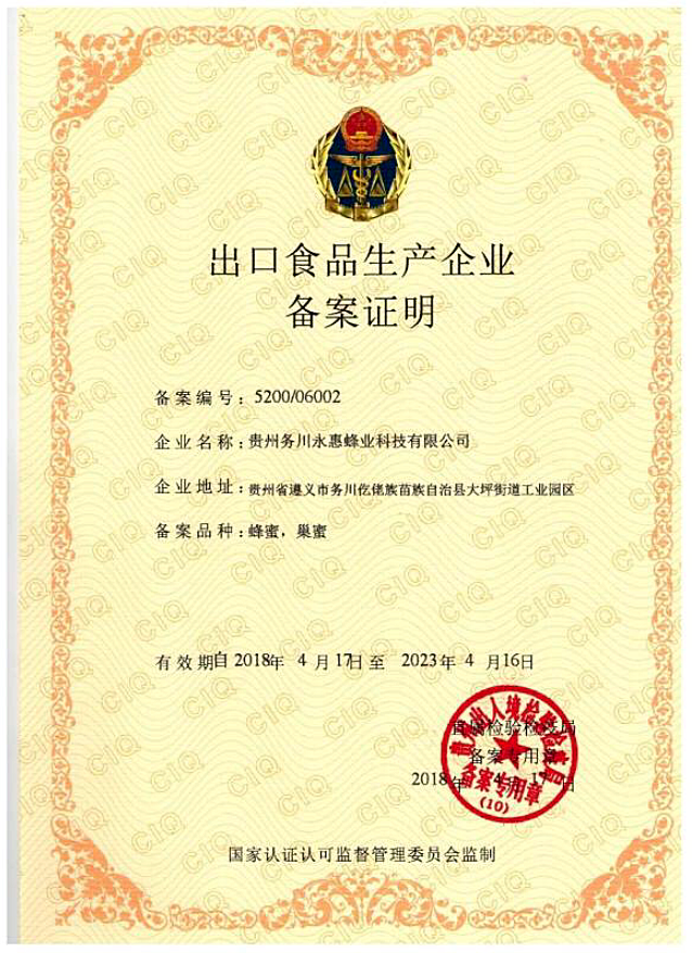 2015年企业获食品生产许可证2016年企业通过ISO9001质量管理体系认证2016年企业通过ISO14001环境管理体系认证 2016年企业通过ISO22000食品安全管理体系认证2016年企业获遵义市市级龙头企业 2017年锯齿山牌蜂蜜获中国绿色食品行业质量可信品牌 2017年企业获贵州省中华蜂养殖示范基地 2017年锯齿山牌五倍子蜂蜜获第二届全国优质蜂蜜品评大赛金奖 2017年锯齿山牌巢蜜获第二届全国优质蜂蜜品评大赛金奖 2018年企业获贵州省省级龙头企业2018年企业通过出口食品生产企业备案2018年企业通过HACCP管理体系认证2018年企业通过欧盟有机蜂蜜和有机巢蜜认证2018年企业通过美国有机蜂蜜和有机巢蜜认证2018年锯齿山牌中蜂结晶蜂蜜获第三届全国优质蜂蜜品评大赛金奖2018年锯齿山牌中蜂百花蜂蜜获第三届全国优质蜂蜜品评大赛银奖2018年锯齿山牌中蜂巢蜜获21世纪第三届蜂业大赛银奖2019年锯齿山蜂蜜获选国家体育总局训练局国家队运动员备战保障产品